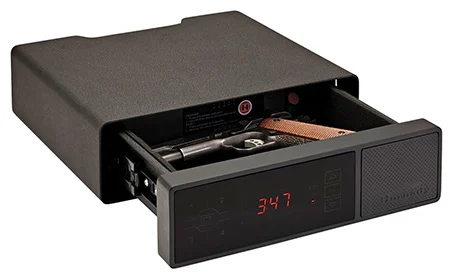 Bulldog Duo LED/Biometric Digital Pistol Vault with a 12 Digit LED keypad and a deluxe biometric reader for optional quick access. Features more than 1000 possible combinations; inner shelf; holds 30 prints; low voltage indicator; soft opening spring loaded door and pre-drilled mounting holes w/hardware. Includes battery backup pack.
