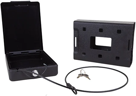 The Dual-Lid Lock Box is uniquely designed to provide two spaces in one, each with a separate lid and keyed alike lock. It can keep two handguns secure or store ammo safely and from your firearm in one space saving, easy-to-carry lock box. The built-in handle makes it simple to transport. Features steel security cable with patented connector; Foldable carry handle and premium foam interior.