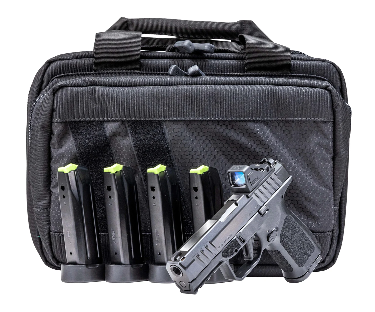 The Archon Type B, Gen 1 a compact, semi-automatic handgun. Featuring an ergonomic grip that stands out in its ability to mitigate unwanted motion when firing. Its intricate design, characterized by complex beveled squares, grants shooters an optimized hold, enhancing accuracy and maintaining impeccable control during use; AF-Speedlock technology, this system incorporates a low bore axis along with a patented breech locking mechanism. The barrel remains straight during the slide cycle, allowing the entire slide of the firearm to nest deeper into the grip. This synergistic design has two significant outcomes: a dramatic reduction in muzzle rise and a tangible decrease in felt recoil. Includes two magazines.