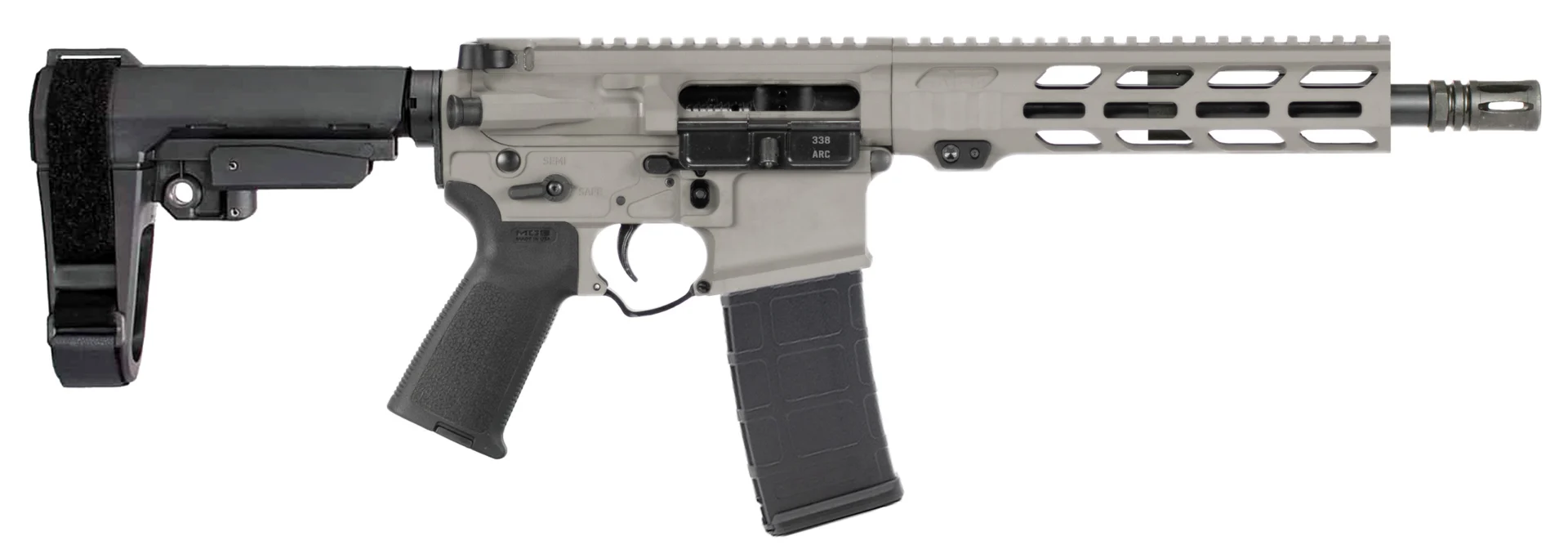 CMMG 45A150FTNG Banshee FE MkG 45 ACP 13+1 5″ Black Nitride Threaded Barrel, M-LOK Handguard, Titanium Cerakote Aluminum Receiver w/Picatinny Rail, Black Polymer CMMG RipBrace, CMMG Zeroed Grip
